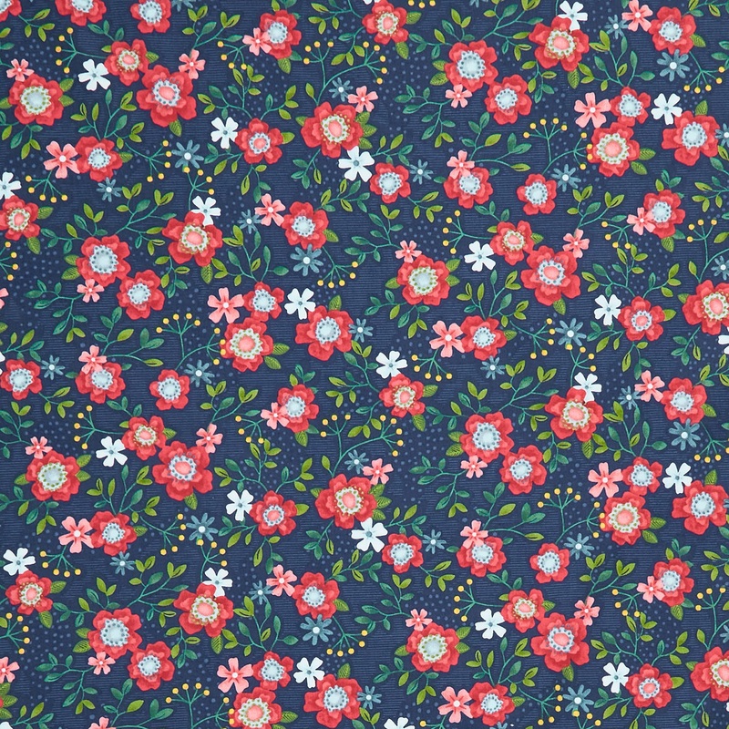 Red, blue, and pink flowers with vines draped across a navy background. Come take a stroll down Wander Lane! Designed by Nancy Halvorsen for Benartex, this collection features sweet florals, berry branches, quaint neighborhoods, and more charming prints yo