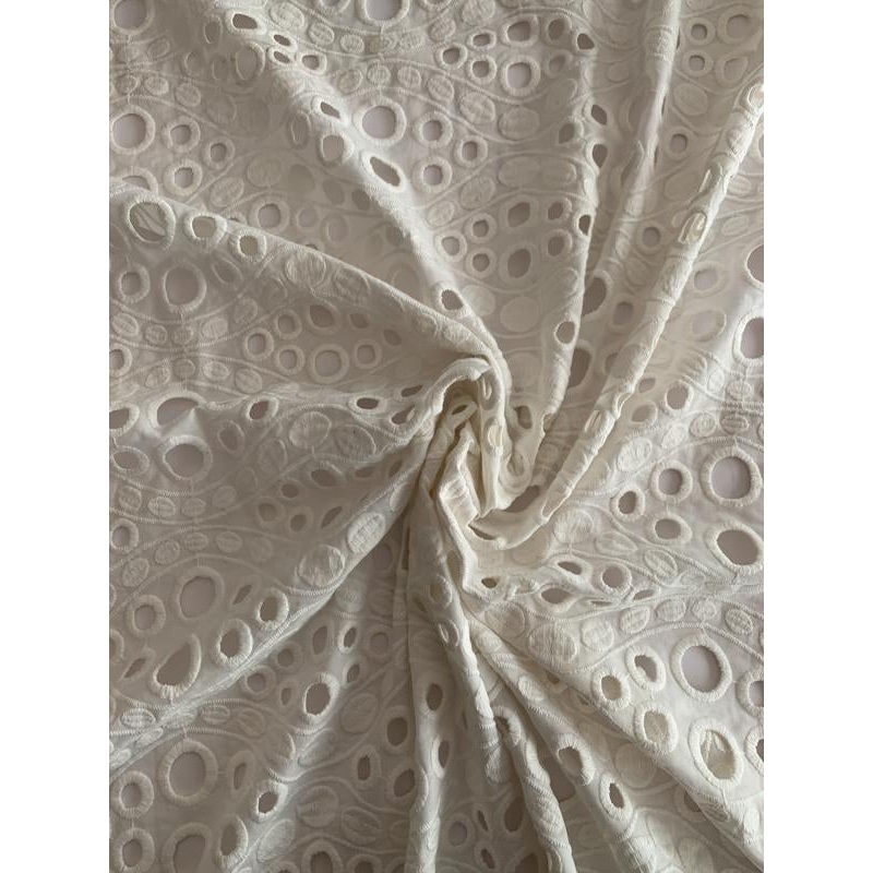 The asymmetric circles and flowing lines create a beautiful effect on this off-white wavy and circular embroidered cotton eyelet designer fashion fabric.