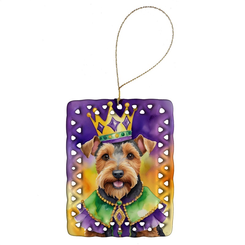 Porcelain Ornament featuring breed specific Welsh Terrier artwork. Celebrate Mardi Gras with this Mardi Gras Ornament. Add a unique, personal touch to your holiday decor with our Rectangular Lattice Porcelain Ornament. Perfect for creating cherished memories, this high-quality ornament shines under festive lights, reflecting warmth and joy throughout your Christmas tree. Crafted with a glossy finish, it showcases vibrant, full-color artwork contributed by our talented artists, ensuring your tree is adorned with a burst of color and holiday spirit. What sets this Porcelain Ornament apart is its customizable white back. Use a paint pen or permanent marker to write a heartfelt message, commemorate a special year, or mark an unforgettable date, turning this ornament into a keepsake that will be treasured for years to come. For best results, allow any personalization to dry thoroughly before handling. Each ornament comes complete with a delicate gold cord, making it easy to hang and display. Proudly made in the USA, this ornament measures 3.375 x 2.625 inches and is a thoughtful gift for pet sitters, teachers, family members, or anyone who would appreciate a little extra holiday magic. Bring style, charm, and a touch of personal meaning to your Christmas tree with this beautifully designed ornament..