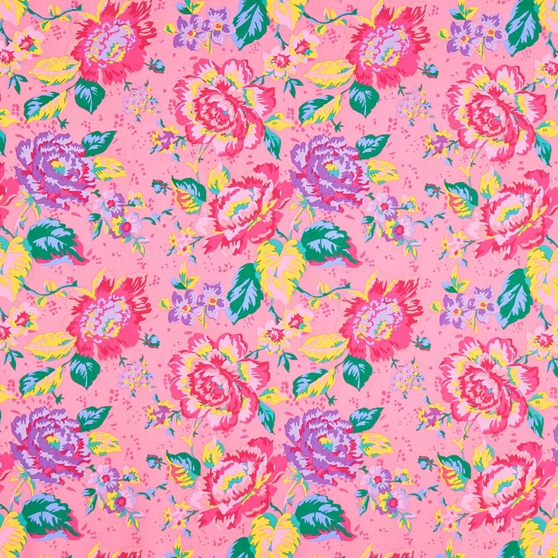 Pink, purple, and yellow flowers with green leaves on a pink background. Escape to a tropical paradise! West Palm Beach by Jennifer Paganelli for Windham Fabrics is a bold and beautiful fabric line that will transport your sewing projects to sunny shores.
