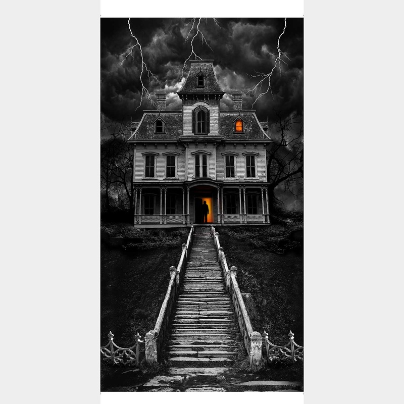 Eerie black and gray fabric panel of a haunted house with a figure in the doorway. Something wicked this way comes! Skeletons, mummies, vampires and more creep through Wicked, a delightfully wicked collection from Timeless Treasures of Soho. These spooky p