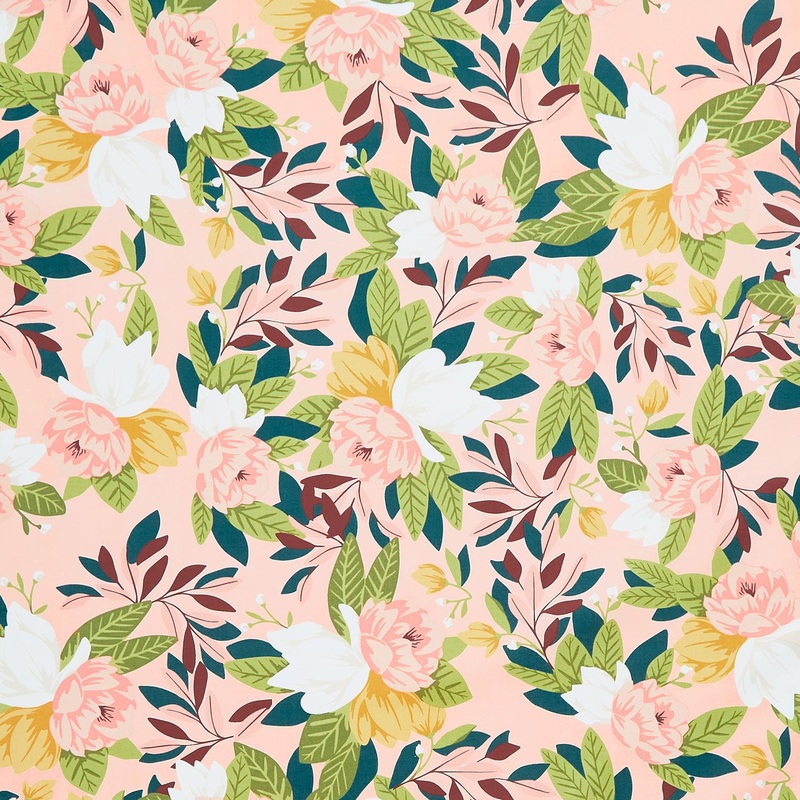 Pink and white Ambrose flowers with slender green leaves on a blush background. Take in the colors of trees, water, and meadows with the Willow collection from Moda. These nature prints in shades of green, aqua, and pink are both soothing and energizing! Relax under a quilt made from this fabric and wake up feeling refreshed!