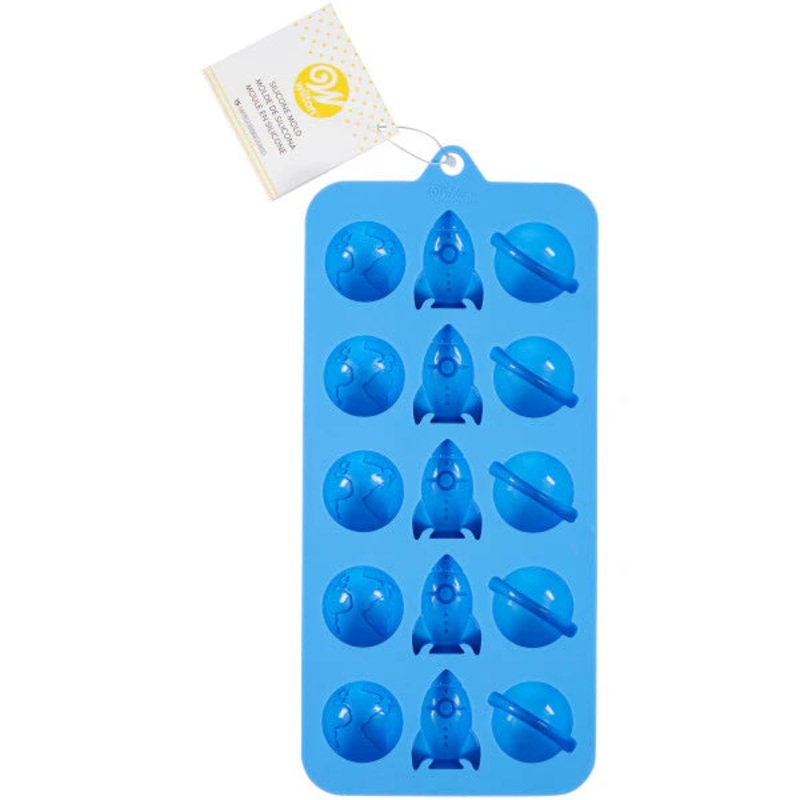 Send imaginations soaring with this fun space-themed silicone mold. Features 3 designs -- Earth, a rocket ship and a planet -- and is great for use with Candy Melts candy, chocolate, gelatin or ice. Use it to create easy decorations or cute party favors.Fe