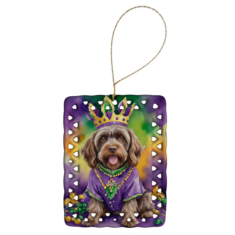 Porcelain Ornament featuring breed specific Wirehaired Pointing Griffon artwork. Celebrate Mardi Gras with this Mardi Gras Ornament. Add a unique, personal touch to your holiday decor with our Rectangular Lattice Porcelain Ornament. Perfect for creating cherished memories, this high-quality ornament shines under festive lights, reflecting warmth and joy throughout your Christmas tree. Crafted with a glossy finish, it showcases vibrant, full-color artwork contributed by our talented artists, ensuring your tree is adorned with a burst of color and holiday spirit. What sets this Porcelain Ornament apart is its customizable white back. Use a paint pen or permanent marker to write a heartfelt message, commemorate a special year, or mark an unforgettable date, turning this ornament into a keepsake that will be treasured for years to come. For best results, allow any personalization to dry thoroughly before handling. Each ornament comes complete with a delicate gold cord, making it easy to hang and display. Proudly made in the USA, this ornament measures 3.375 x 2.625 inches and is a thoughtful gift for pet sitters, teachers, family members, or anyone who would appreciate a little extra holiday magic. Bring style, charm, and a touch of personal meaning to your Christmas tree with this beautifully designed ornament..