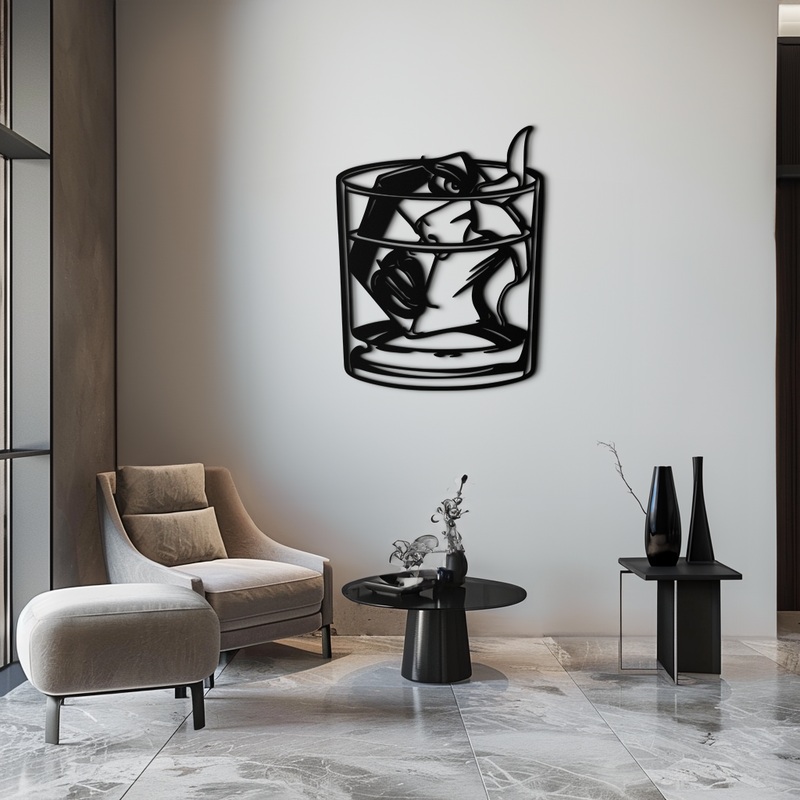 Add a bold and artistic flair to your bar, lounge, or home decor with our Woman in Whiskey Glass Metal Wall Art. This captivating design features a stylized female figure immersed in a whiskey glass filled with large ice cubes. The silhouette captures a modern and edgy theme, perfect for creating a conversation piece in any interior space.