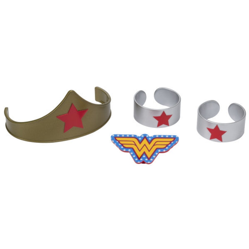 Turn any ordinary child into a super hero with this Wonder Woman DecoSet. Set includes a combed tiara, arm cuffs and a clip pendant. 5-Piece set.Dimensions:Wonder Woman cake topper, bracelet.: 2.05 x 2.05 x 1.0 inchesWonder Woman cake topper, Logo.: 2.9 x