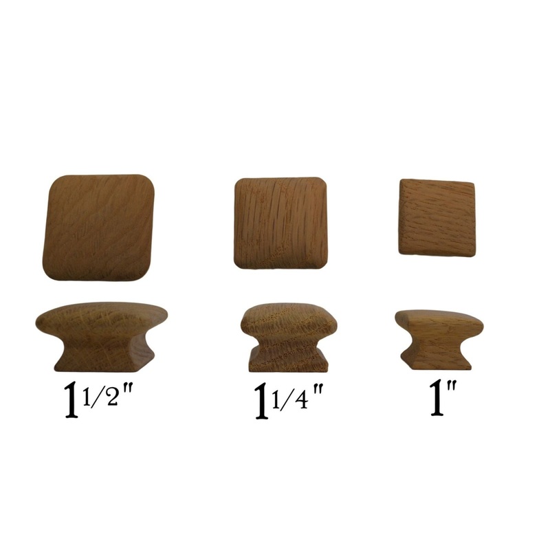 Square Wooden KnobSquare Oak Knob with pedestal base.Unfinished & ready for you to match to your piece of furniture.Available in 2 Sizes.Medium - Diameter: 1-1/4" Projection: 7/8"Large - Diameter: 1-1/2" Projection: 15/16"Mounting hardware included.**THIS