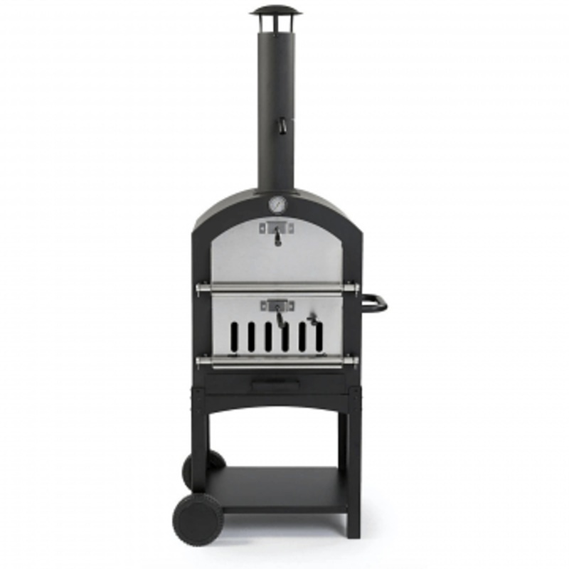 A built-in chimney damper and oven thermometer allow for temperature control and monitoring. Cook with indirect heat using the included pizza stone, or cooking directly on the grates. Includes a freestanding cart with a storage shelf and wheels.